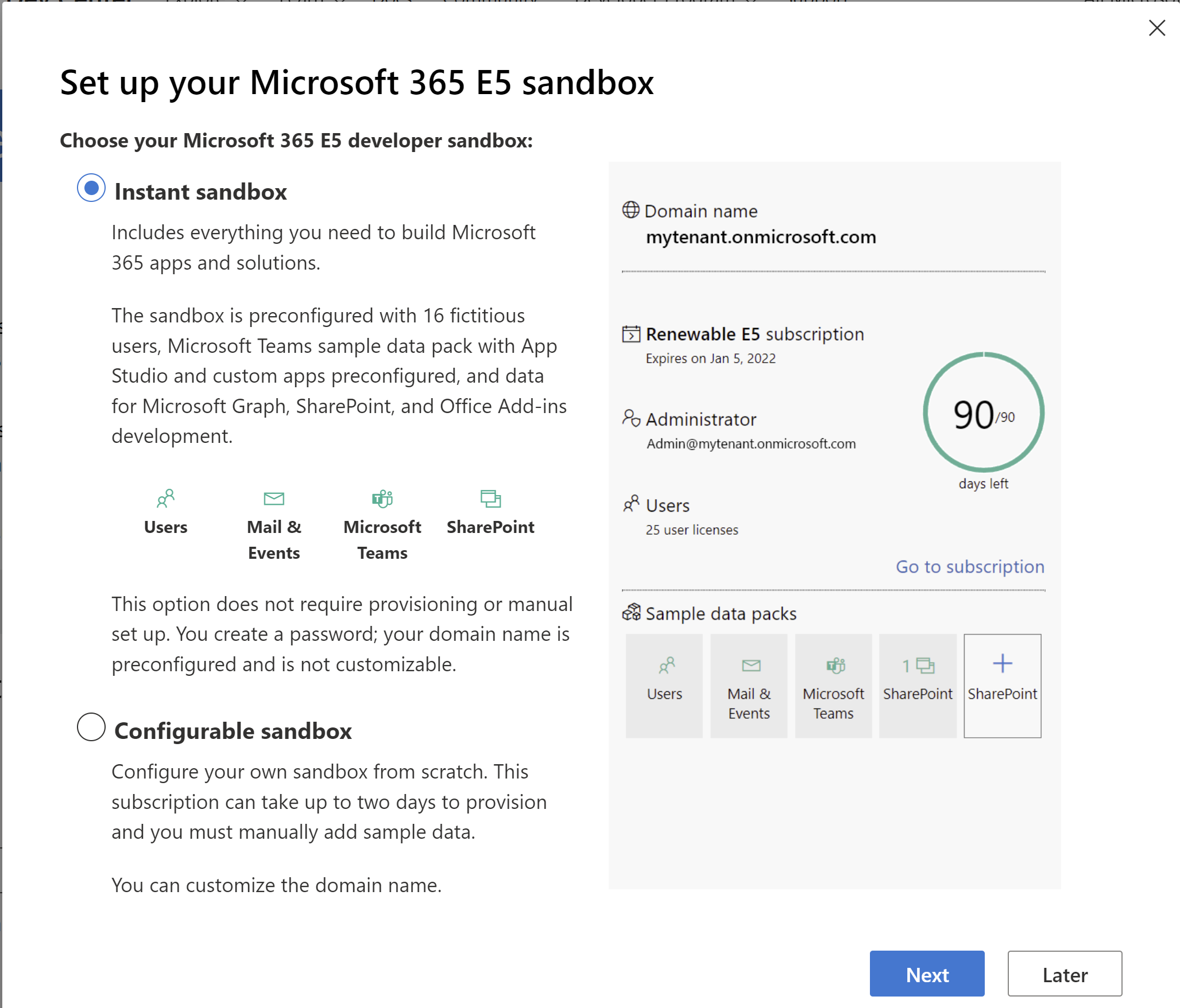 - On the popup, choose one of the options. I’ve chosen ‘Instant sandbox’.