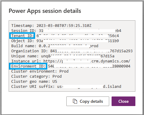- From the ‘Power Apps session details’ popup, copy ‘Tenant ID’ and ‘Environment ID’.