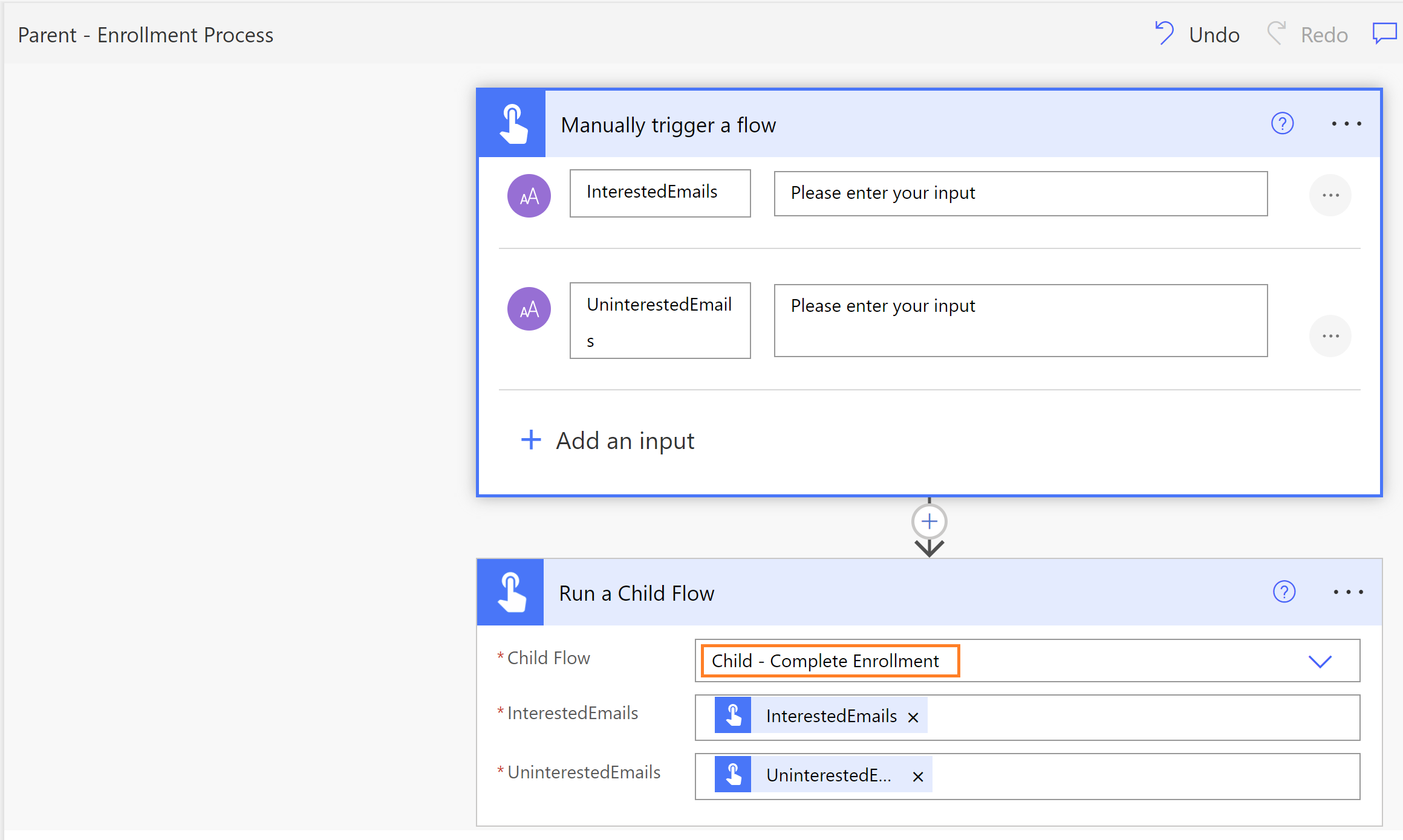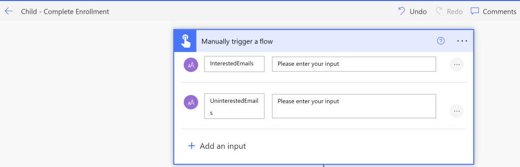 - Parent – Enrollment Process – Triggers the child flow ‘Child – Complete Enrollment’ by passing comma separated Email Ids.