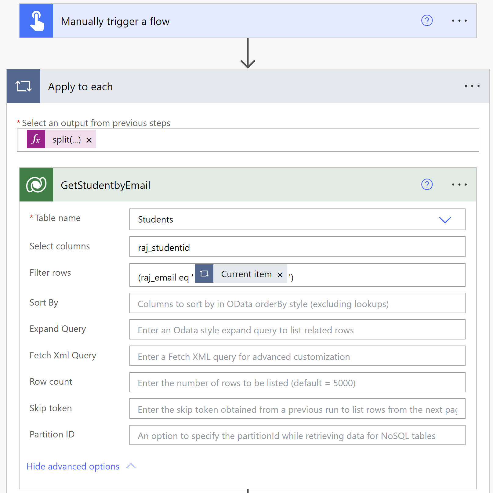 - I’ve renamed the List Rows action to ‘GetStudentbyEmail’ and in ‘Filter rows’, I am passing the ‘Email Id’ from Split function.