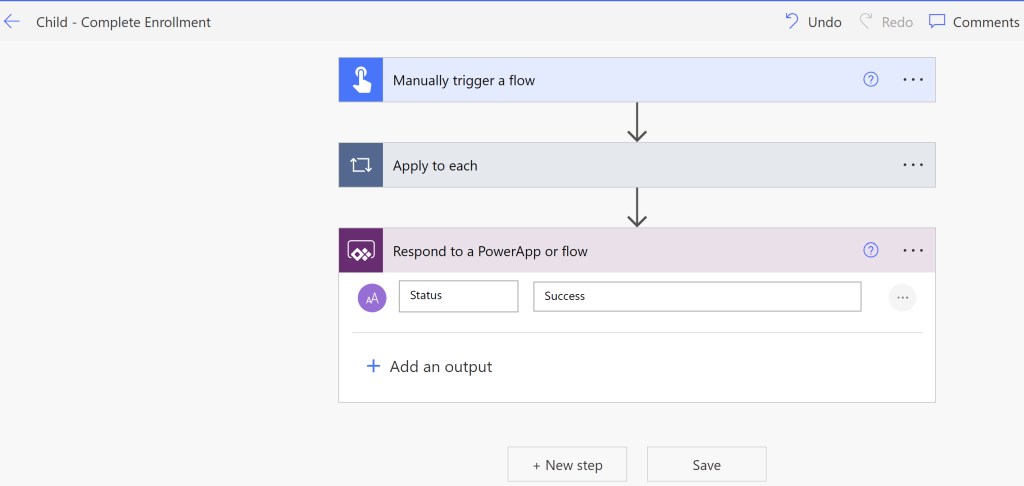 - Open the ‘Child – Complete Enrollment‘ flow and add Respond to a Power App or flow action.