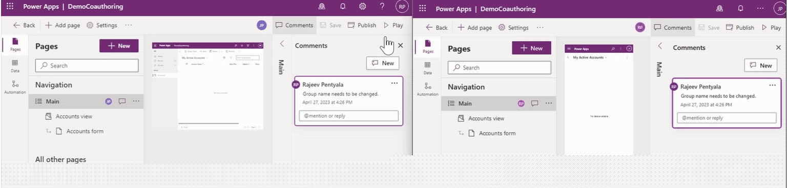 - Coauthoring allows multiple makers—whether pro or citizen developers—to make changes to the app at the same time and see those changes in real time.