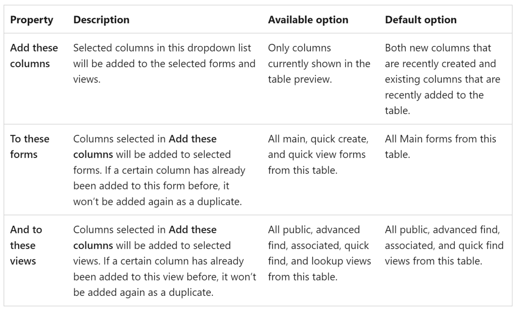 In this walkthrough, you’ll learn how to simply add the columns you created to forms and views of this table without manually doing so in the form or view designer.