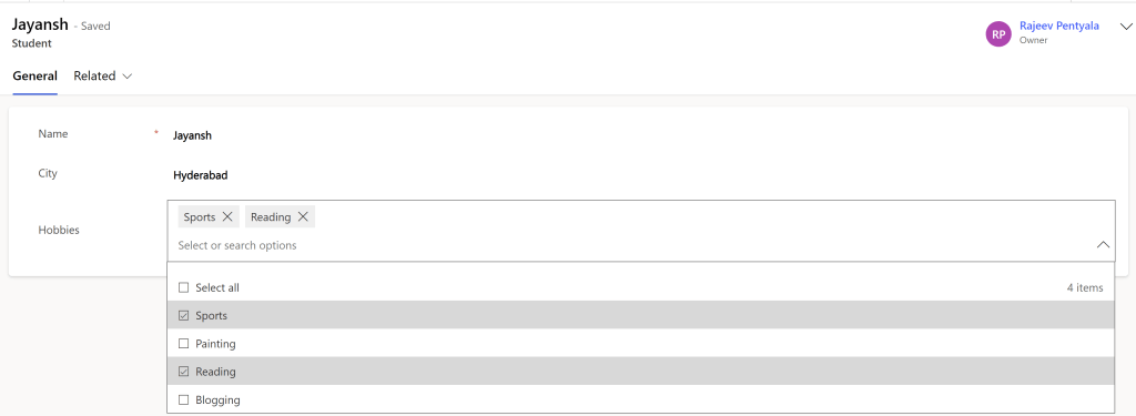 I’ve a following ‘Student’ table with a Choice (i.e., City) and a Choices (i.e., Hobbies) columns.