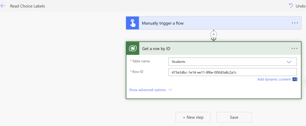- Create a new Instant flow and add a Get a row by ID Dataverse action as shown below. Paste the record GUID copied in the above step in the ‘Row ID’ column.