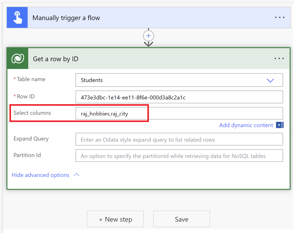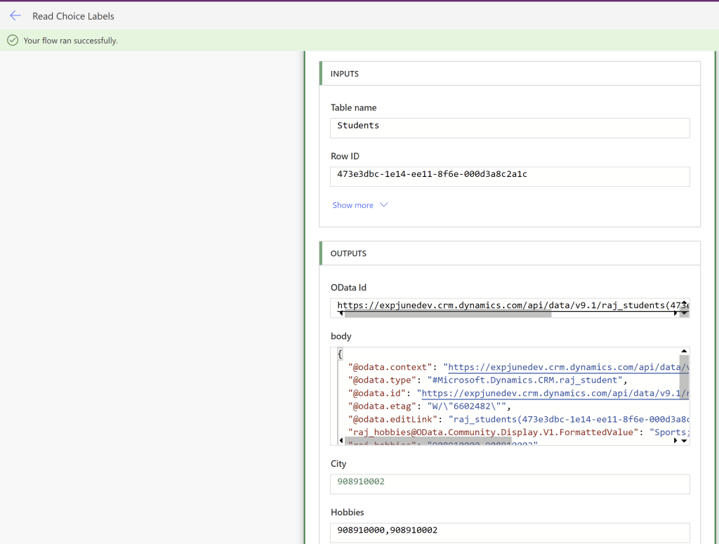 By default, cloud flow Dataverse actions fetches the ‘Value’ of Choice columns. Lets see how to fetch the ‘Label’ of both ‘City’ and ‘Hobbies’ columns from the cloud flow.