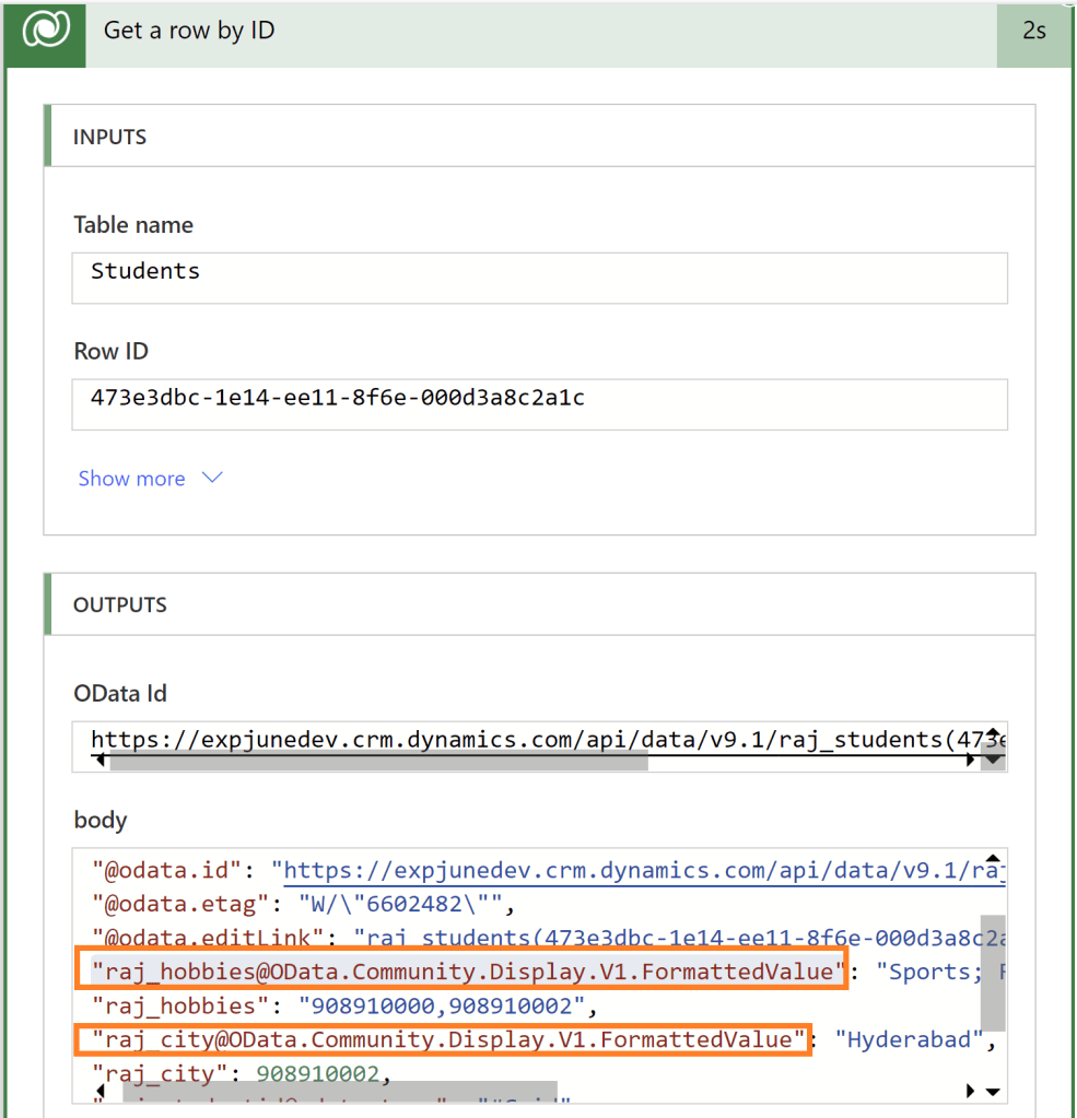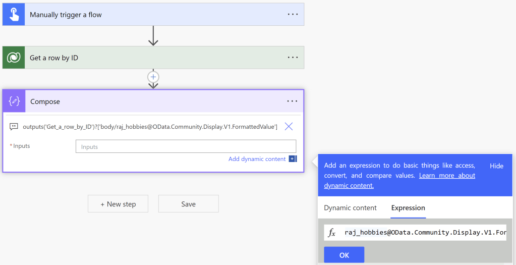 - outputs(‘Get_a_row_by_ID’)?[‘body/raj_hobbies@OData.Community.Display.V1.FormattedValue‘]
