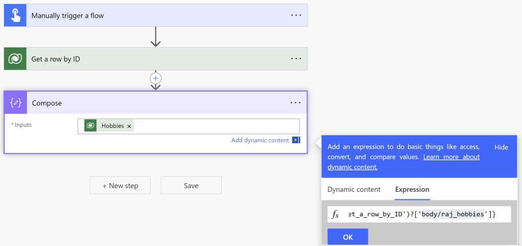- Go back to flow editor and add a Compose action and map the ‘Hobbies’ column of from the Get a row by ID action.