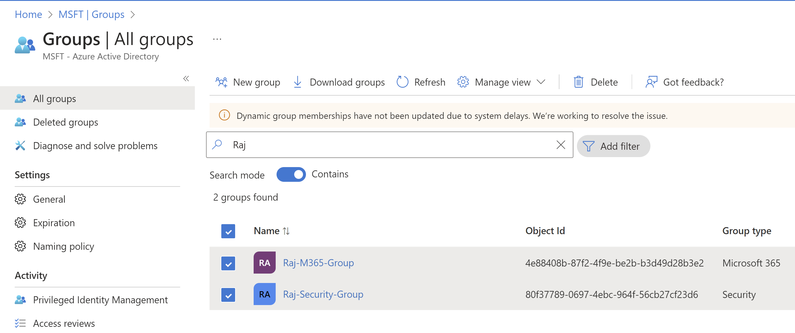 Coming to my scenario, I’ve 2 groups Raj-M365-Group which is a Microsoft 365 group and Raj-Security-Group which is a Security group.