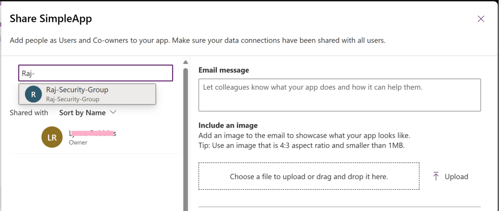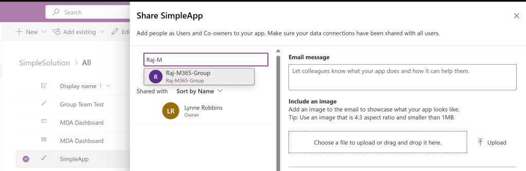 - That’s all you need to do. Go to the Canvas App share pane, search for the Raj-M365-Group, and you should be able to find it now.