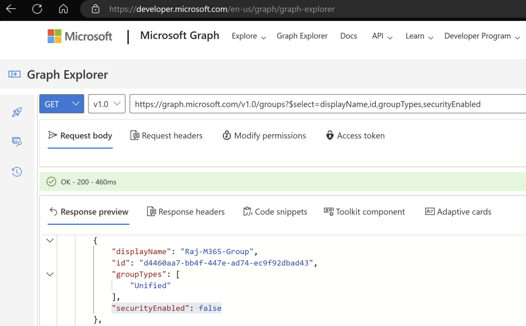 So when I checked the Raj-M365-Group information using the Graph Explorer, I could see the ‘securityEnabled’ flag was ‘false’.