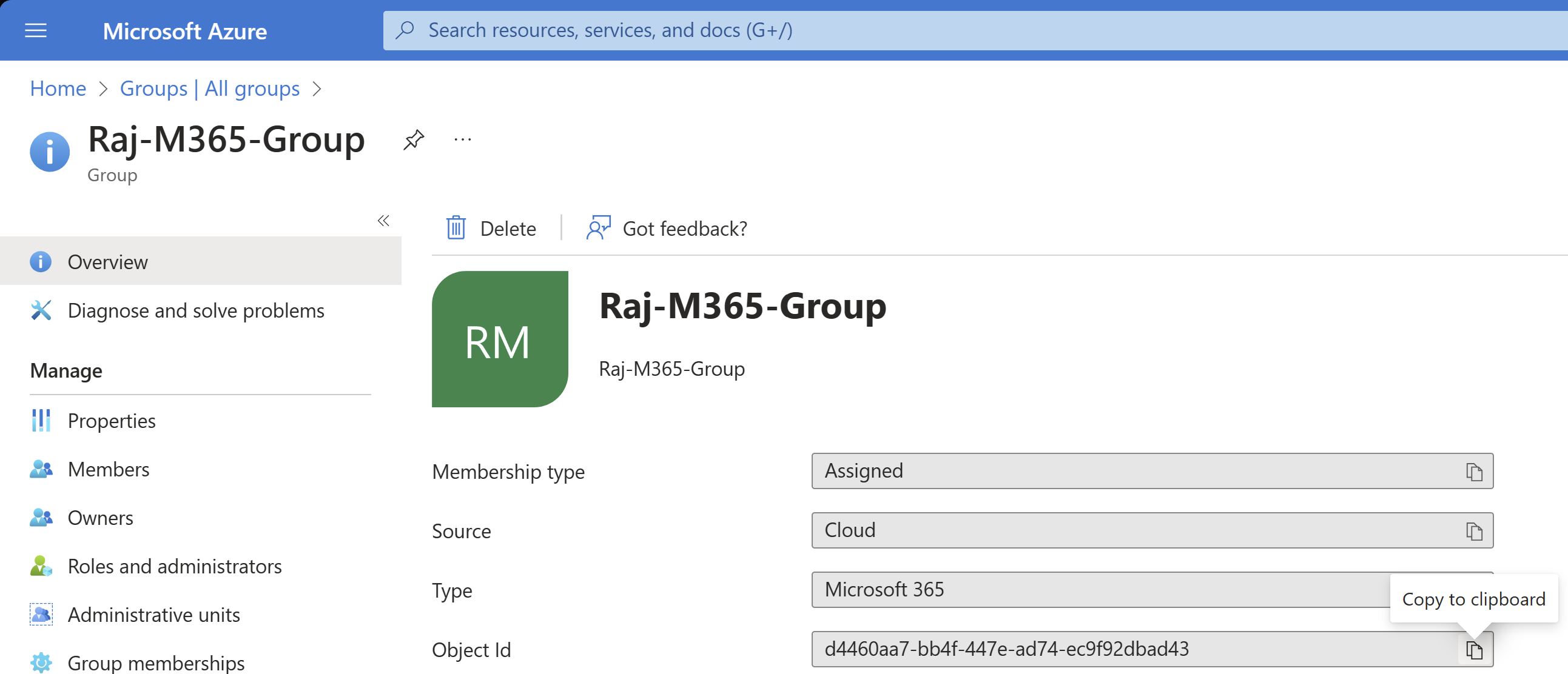 - We need the Raj-M365-Group object id, so, go to Azure portal > Azure Active Directory > Groups, select the Raj-M365-Group, and then copy the Object Id.