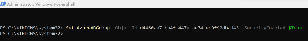 - Use the cmdlet Set-AzureADGroup to set the SecurityEnabled property to True: