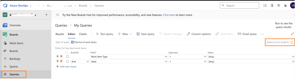- When you check the ‘Query across projects‘ checkbox, it adds the ‘Team Project‘ field to the filter.