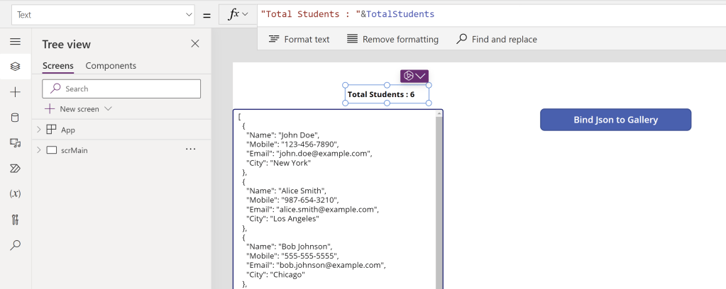 Table(ParseJSON(txtJsonInput.Text)) As tblStudents). - Then using ForAll function to loop through each row in the Table and adding to