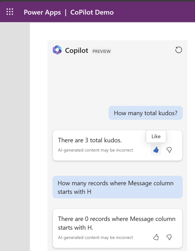 For example, I’ve added a Copilot control to my Canvas App and by default, App users can provide feedback by selecting Like (thumbs up) or Dislike (thumbs down) button for each response that Copilot provides.