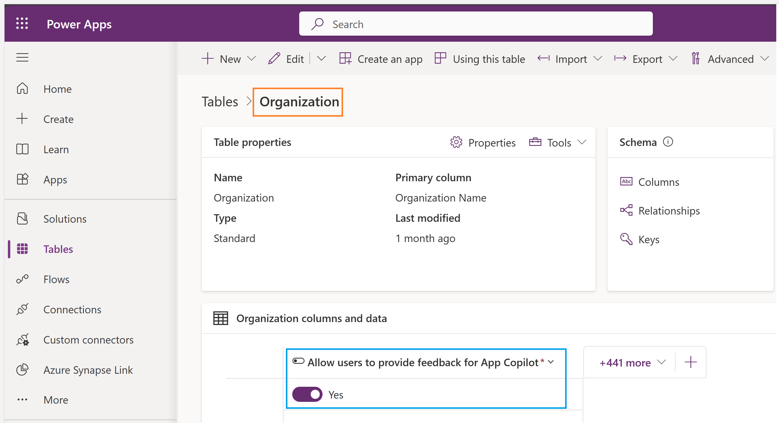- In the Organization columns and data section, select the list of columns and search for Allow users to provide feedback for App Copilot.