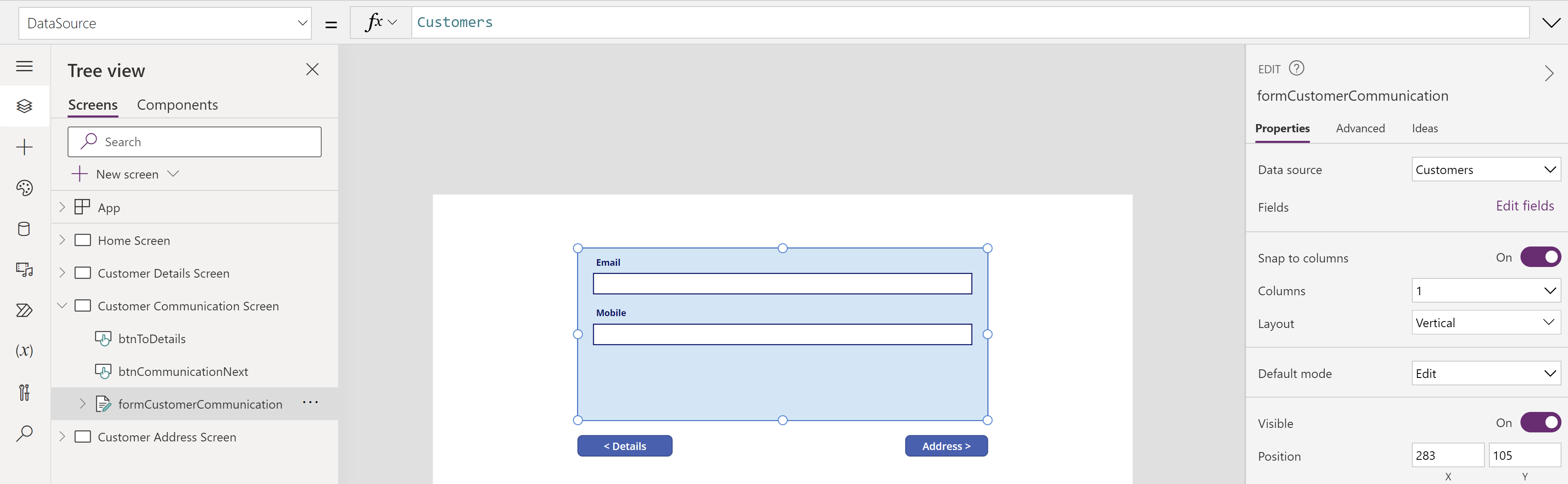 - Add a Form control, set ‘Customers’ as Data source and include the ‘Email’ and ‘Mobile’ columns.