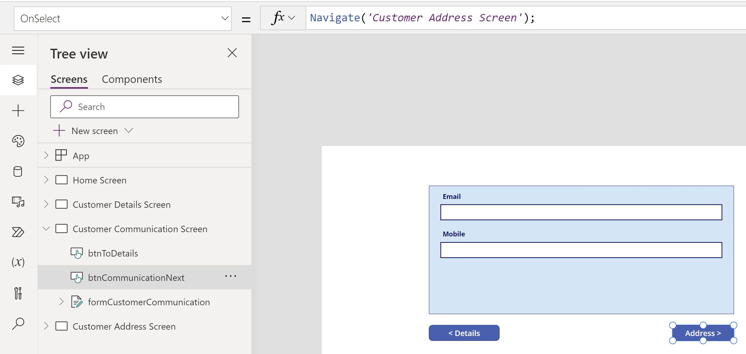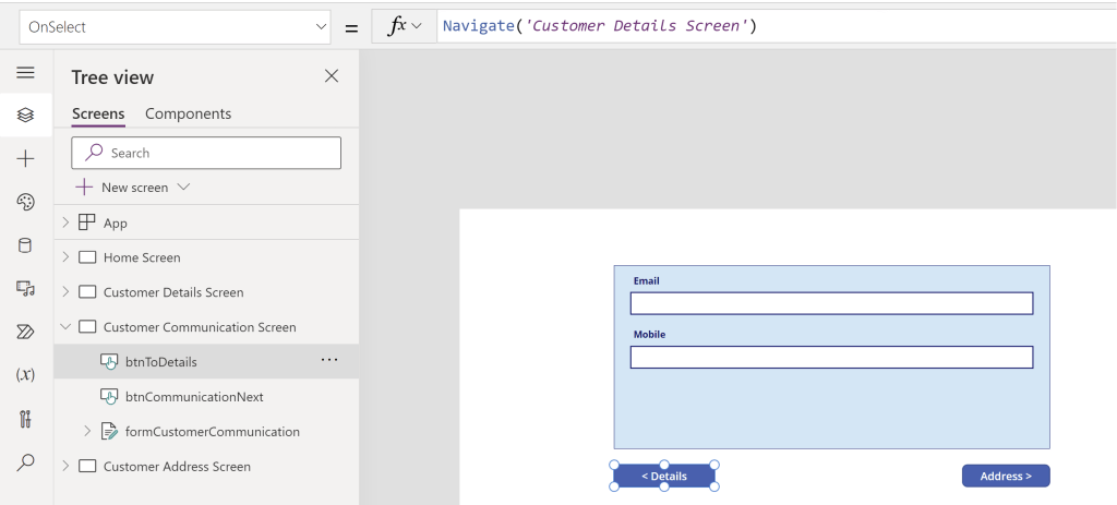 - To establish back-and-forth navigation among “Customer Details Screen”, “Customer Communication Screen” and “Customer Address Screen”, add buttons and use Navigate function.