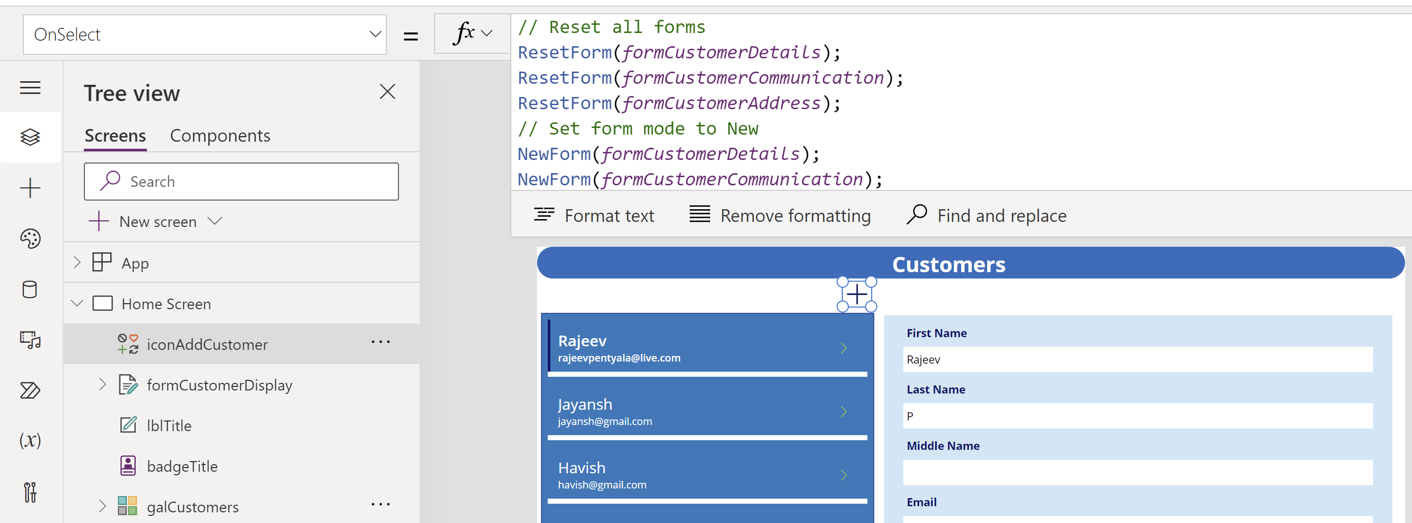 - Add a Gallery control and Form control to display the data of the selected Customer record from the Gallery.