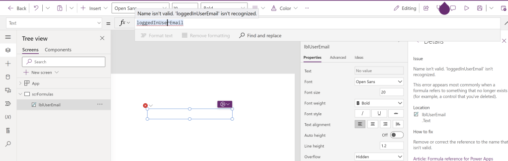 - Lets add a Label control and map the ‘loggedInUserEmail’ formula to the ‘Text’ property.