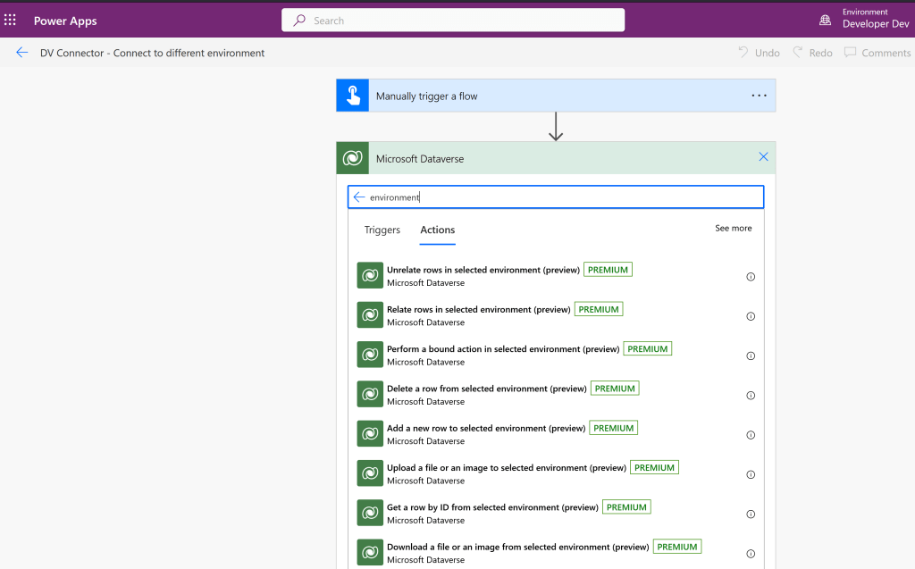 - Select a Dataverse Connector and search the actions with ‘Environment’ keyword as shown below.