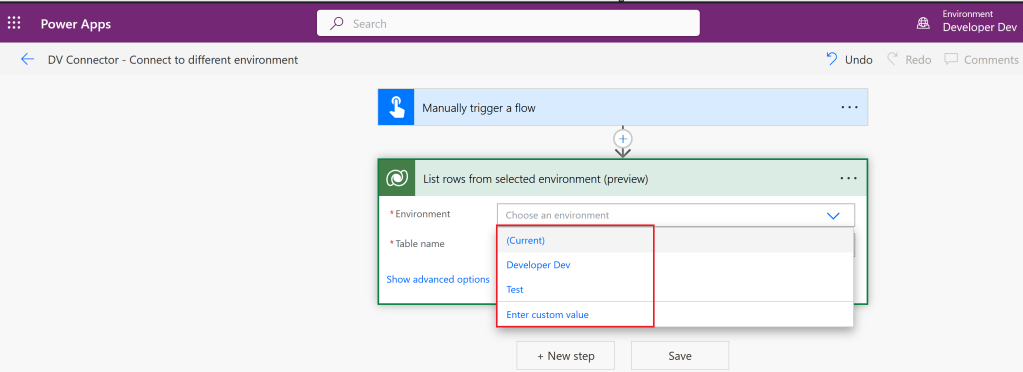 With this new preview feature, Dataverse connector gains the ability to connect to different environments by introducing the Environment parameter.