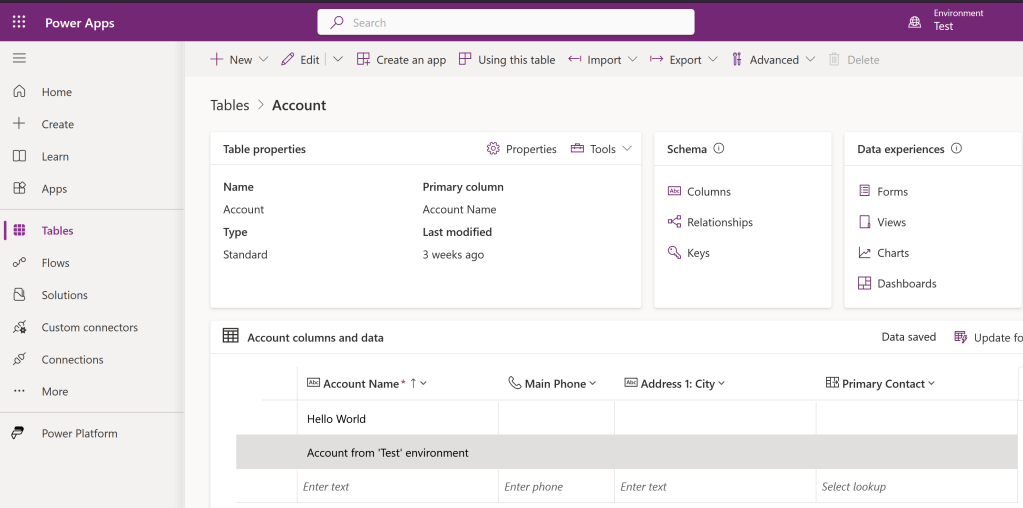 - I’ve selected ‘Test’ as the Environment and ‘Account’ as the table.