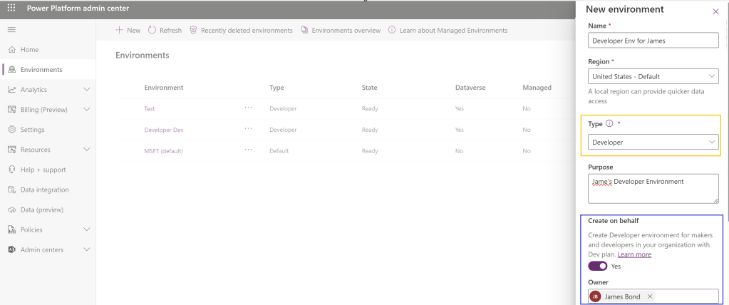 Did you know that as an admin you can create a Developer Environment for another User?. You can use ‘Create on behalf‘ toggle and provide the User Id to whom you would want to create the Developer Environment for.