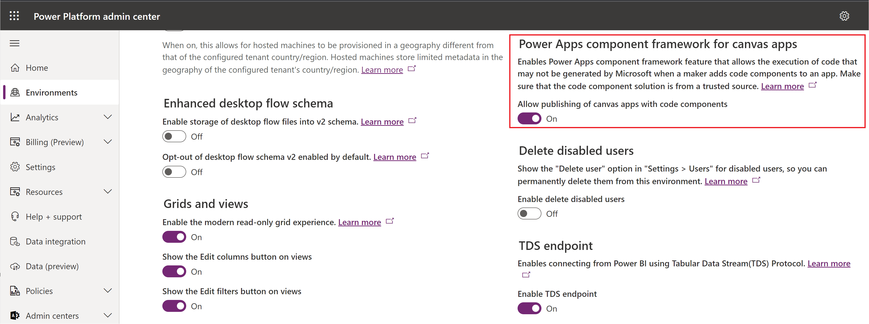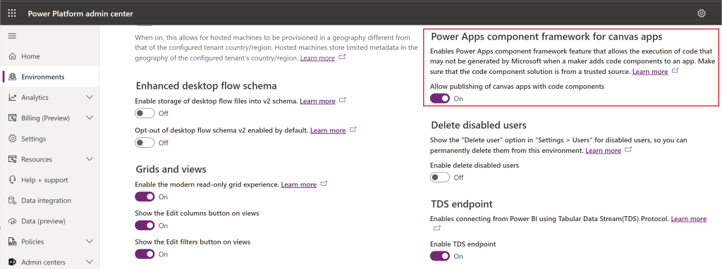 Imagine you need to enable the ‘Power Apps component framework for canvas apps‘ setting in your Power Platform environment. The process is straightforward: connect to the Power Platform Admin Center and go to environment settings and enable it as shown below.