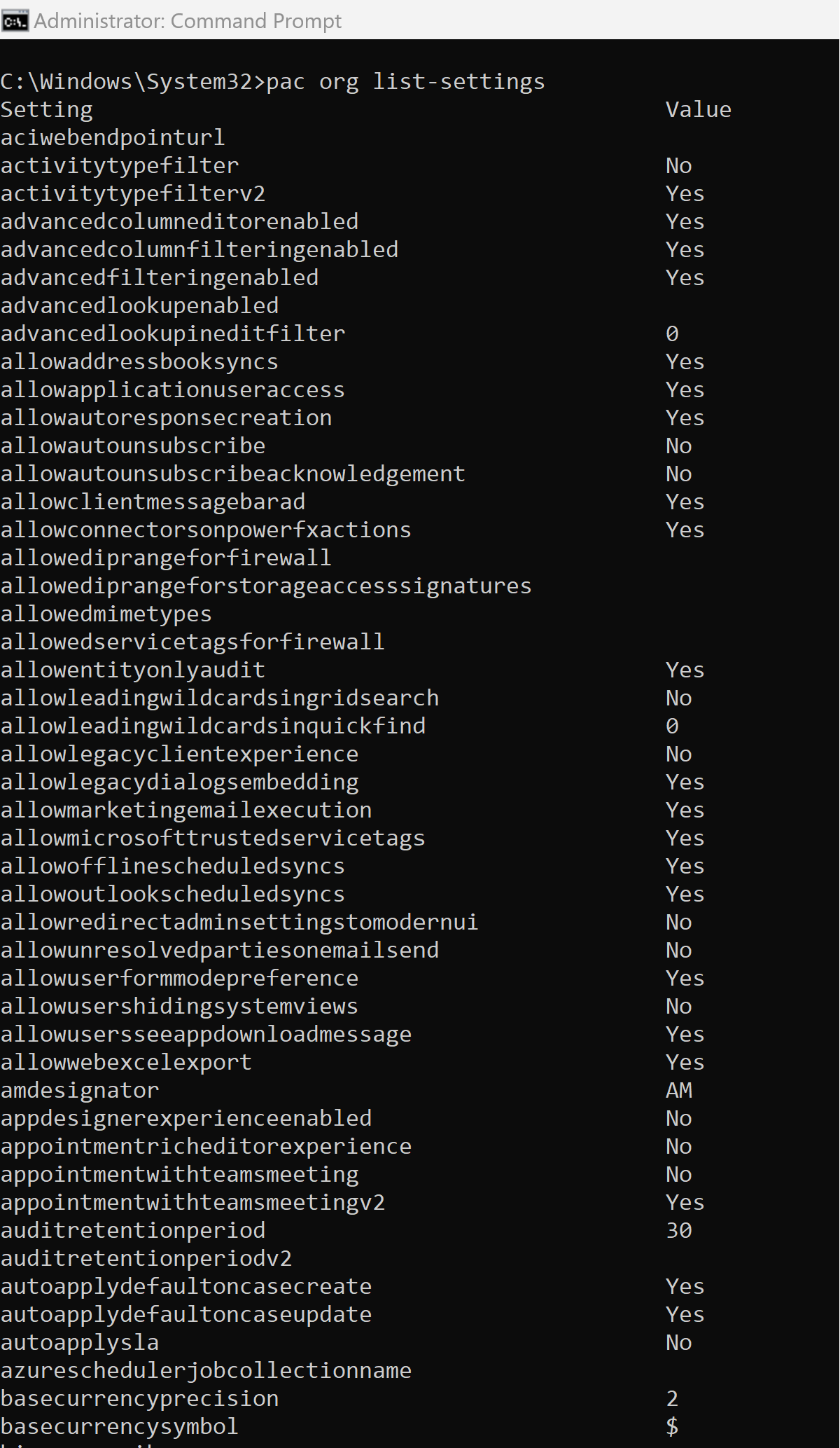 - Lets first execute pac org list-settings command to retrieve the list of environment settings.