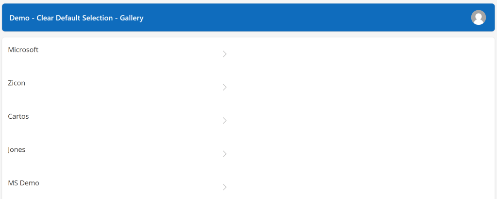 By default, the first record in the Gallery control is selected. In the example below, ‘Microsoft’ is the first record and is selected by default..