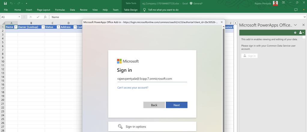 - Open the downloaded file and click on ‘Sign in’ within the ‘Microsoft PowerApps Office Add-in’ task pane to proceed with signing in to the Dataverse environment.