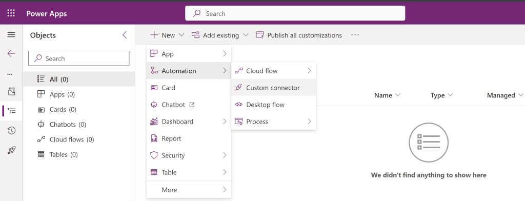 - Create a new Dataverse solution and from the solution, select New > Automation > Custom connector