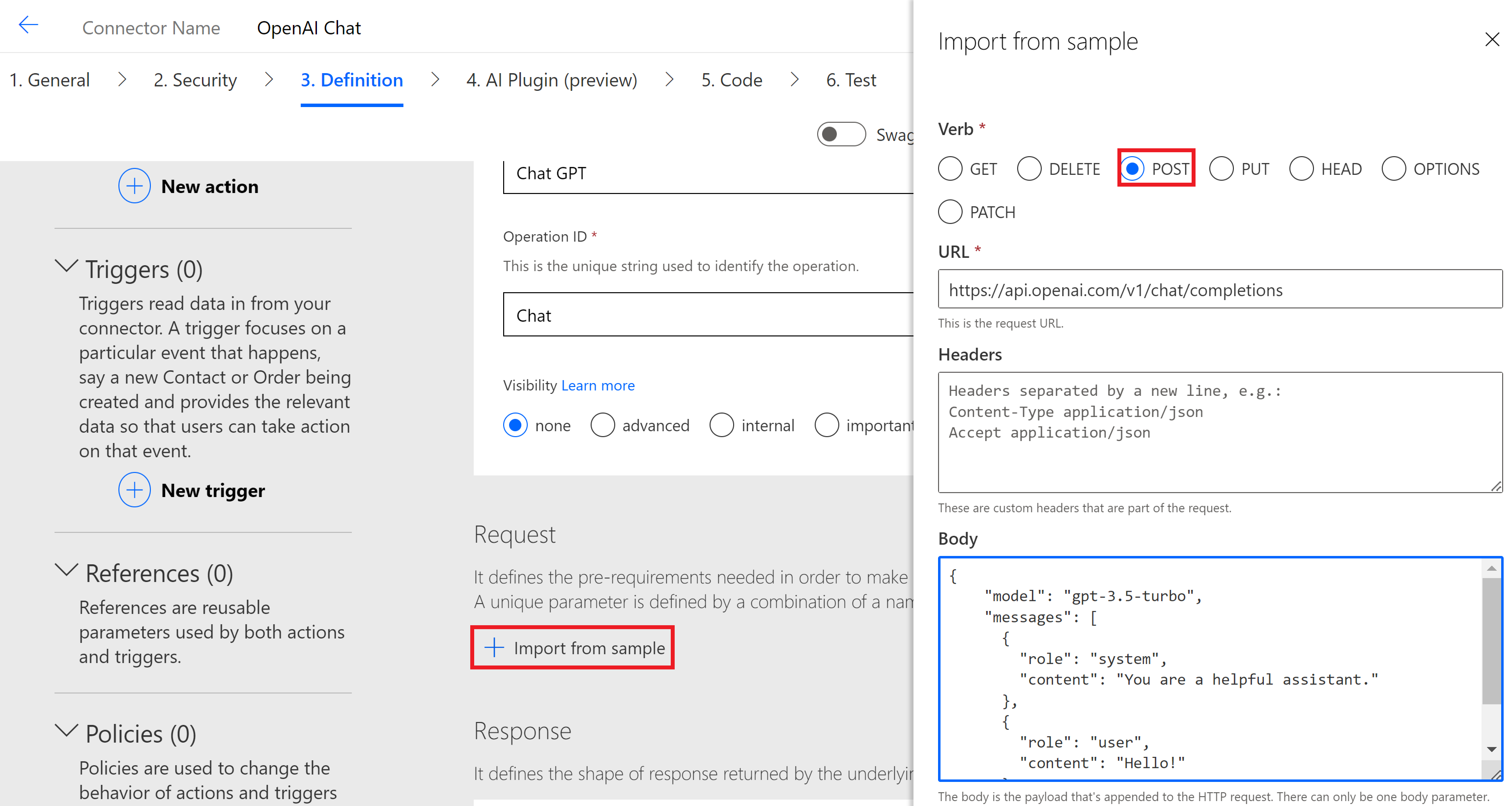 - Create a Custom Connector using the Chat end point.
