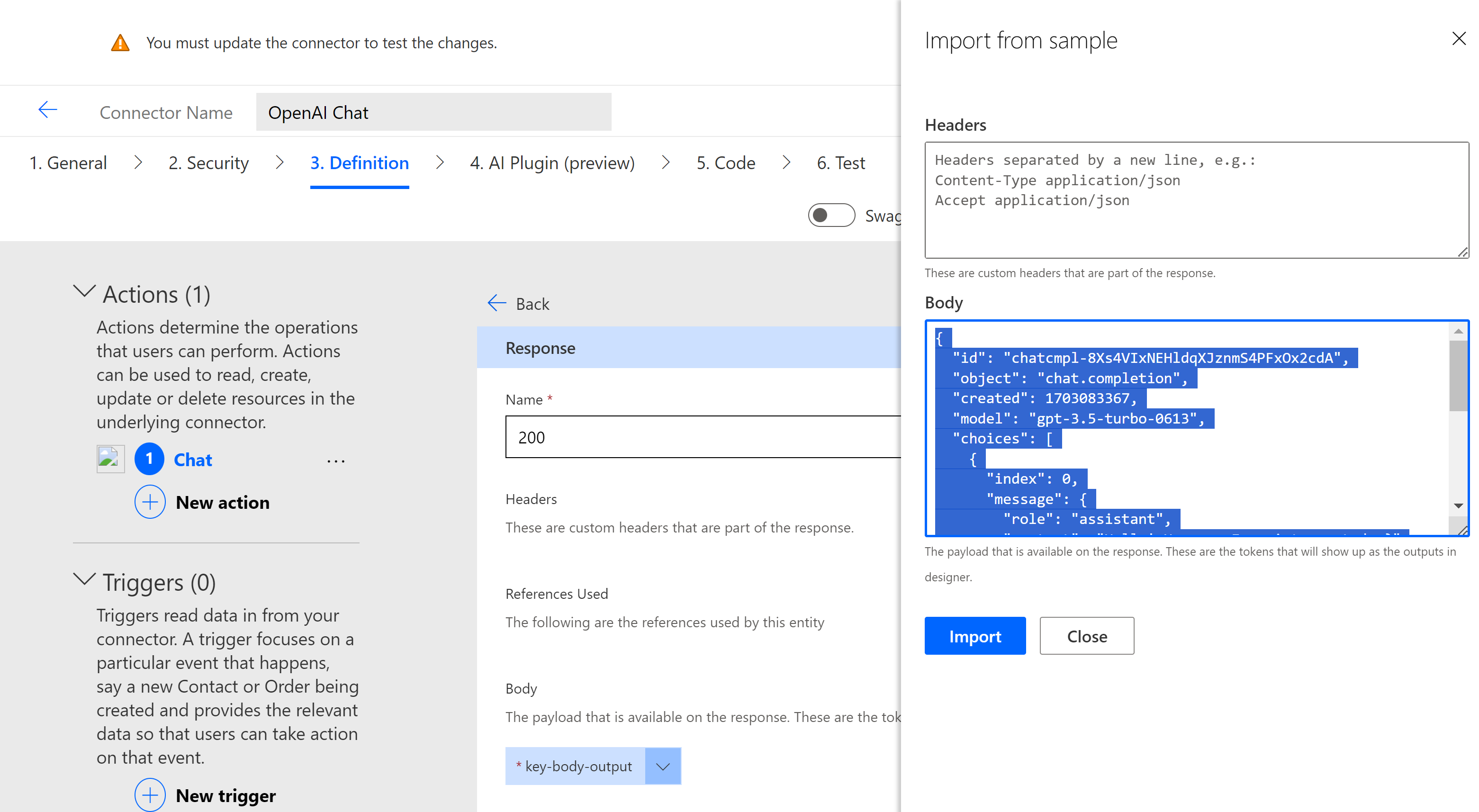 - In the ‘Body’, paste the response copied from test. Click ‘Import’.