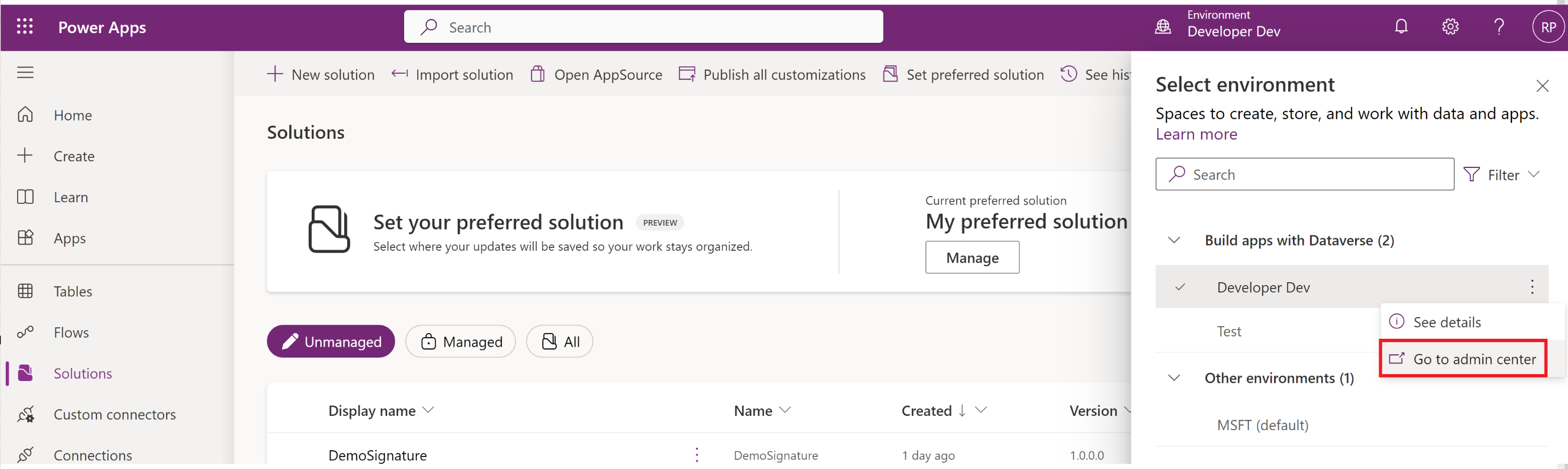 - From the maker portal, select the environment and click on ‘Go to admin center’.