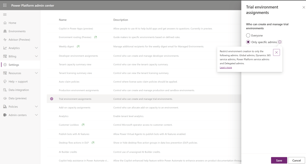 For example, if you want to restrict the creation of Trial environments, Developer environments, or Production environments to only Admins, you can configure these using the settings listed in Tenant Settings .