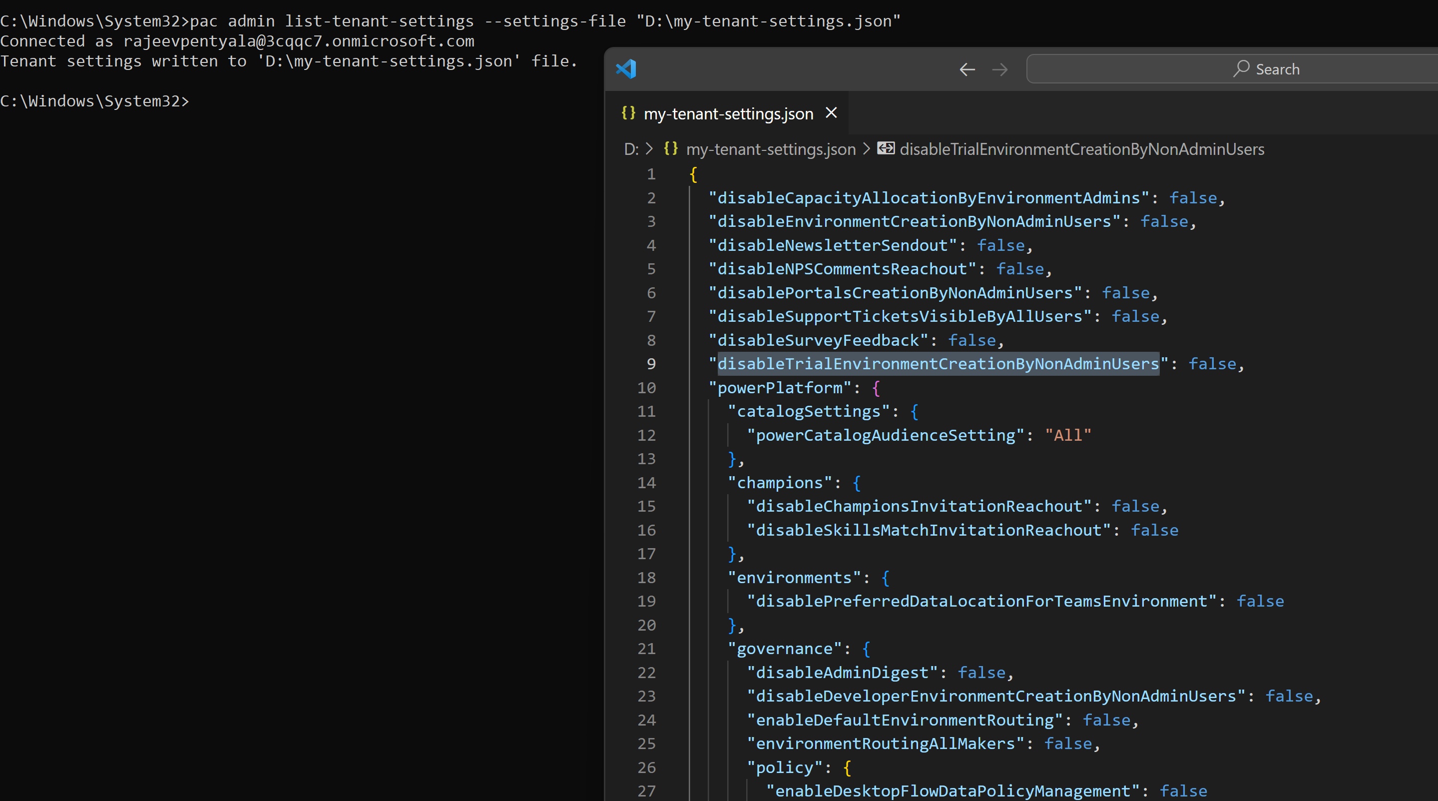 - Execute the pac admin list-tenant-settings command. This command generates a JSON file locally, as shown below.