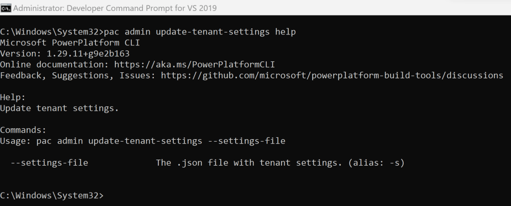 - pac admin update-tenant-settings allows you to bulk update the Tenant settings and update settings that you can’t modify via the Power Platform Admin Center settings page.