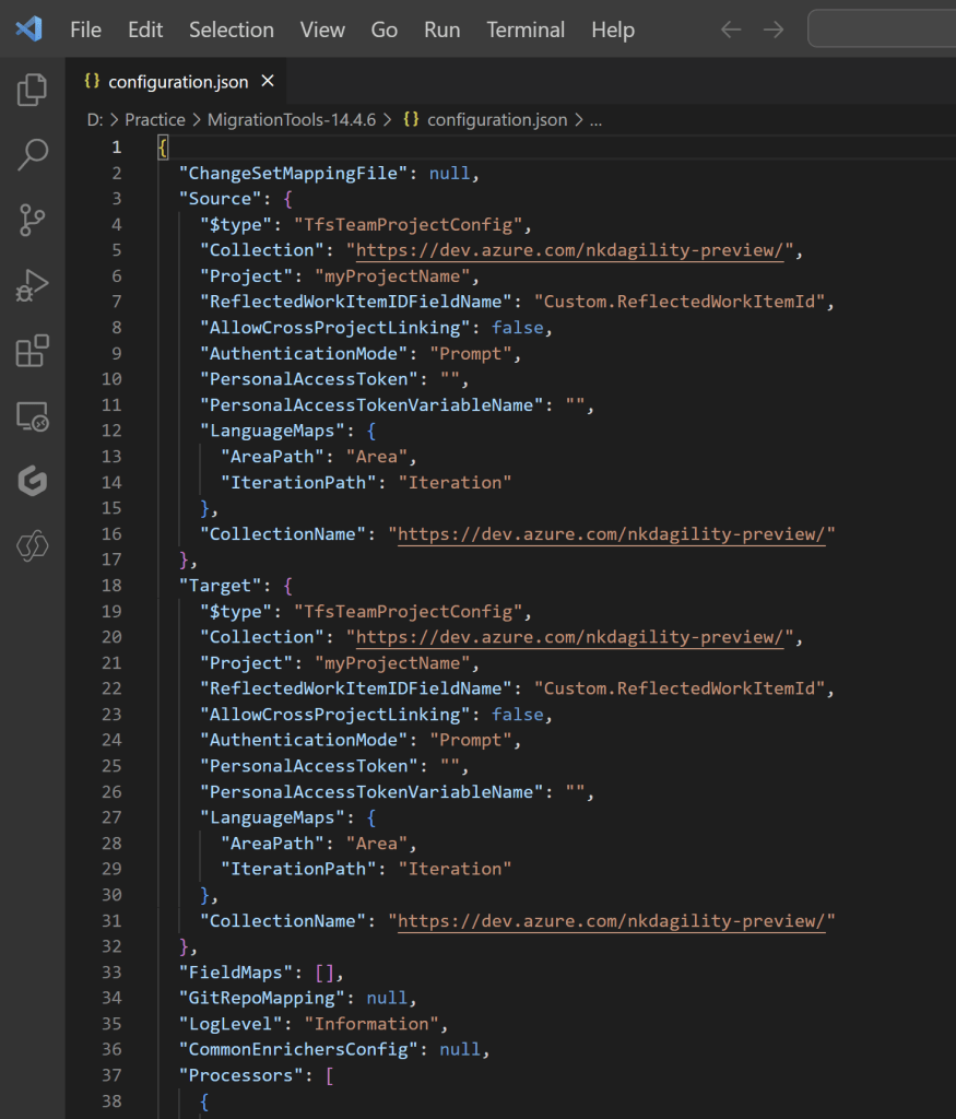 - Update ‘Configuration file’ with your source and destination DevOps project details and authentication details.