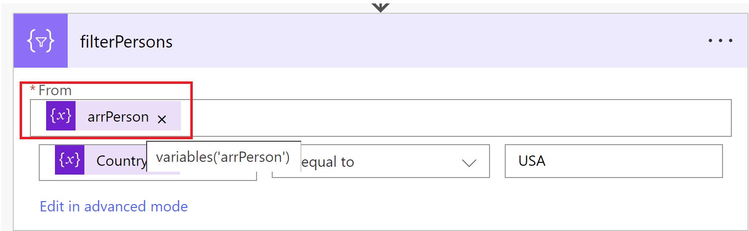 - To filter the ‘arrPerson‘ array where ‘Country’ name is ‘USA’, set the ‘From’ of the Filter Array action as ‘variables(‘arrPerson‘)‘, as highlighted below.