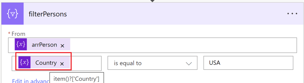 - Set the right operand as ‘item()?[‘Country’]‘ as highlighted below.