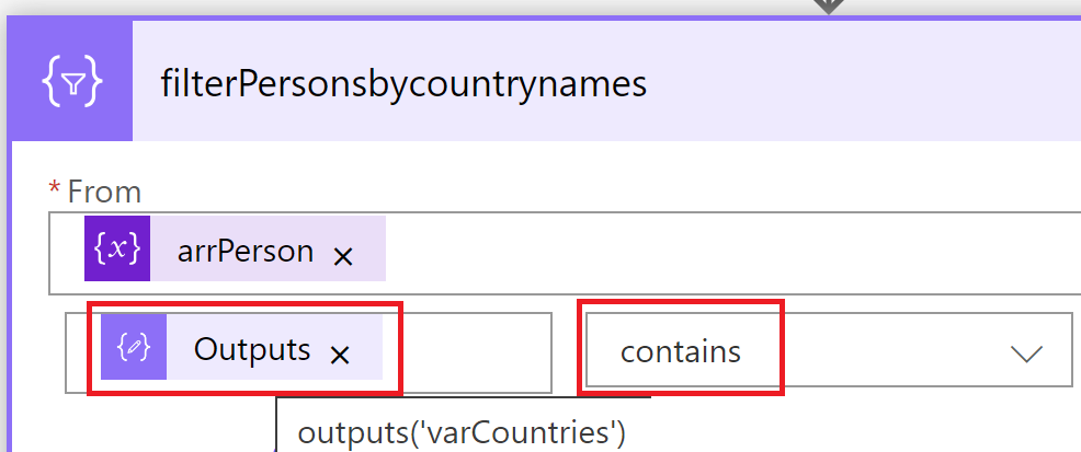 - In the condition, set the left operand as ‘outputs(‘varCountries’)‘ and operator as ‘contains‘ as highlighted below.