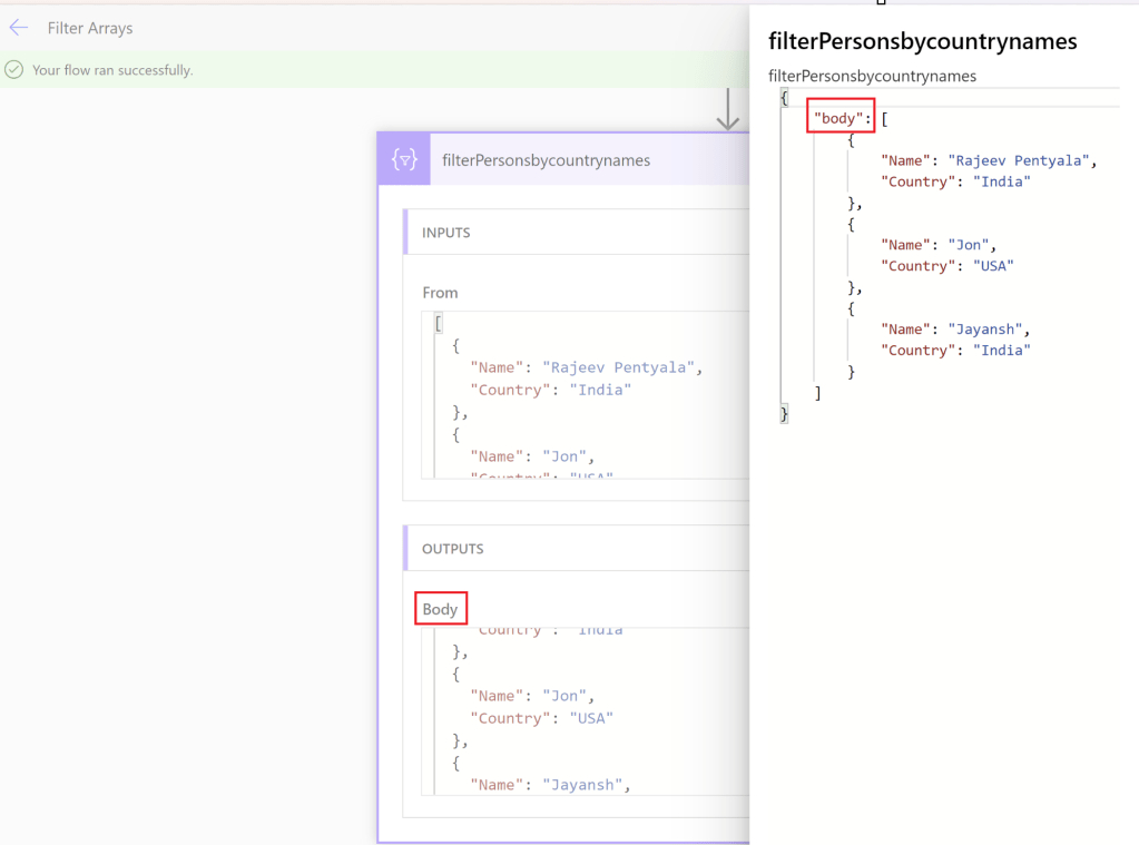 - Save and test the flow. The ‘filterPersonsbycountrynames’ action’s outputs must consist of 3 records where the Country is either ‘India’ or ‘USA,’ as highlighted below.
