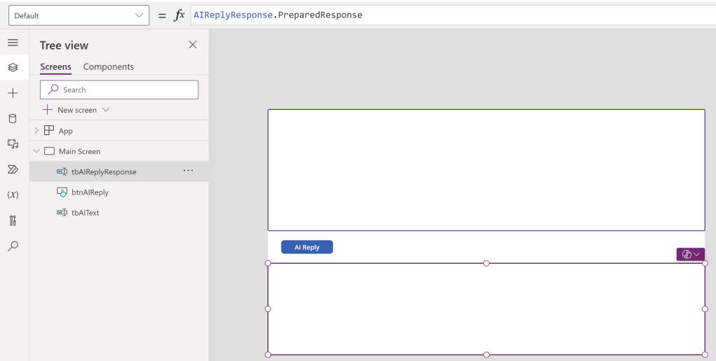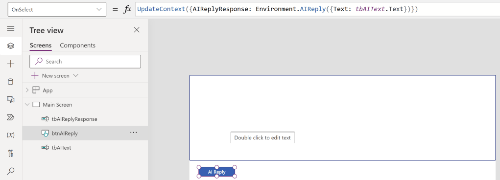 - Lets try the ‘AIReply‘ function. Add a textbox and a button control. On the ‘OnSelect’ event of the button, use the following formula to store the response in the ‘AIReplyResponse’ context variable.