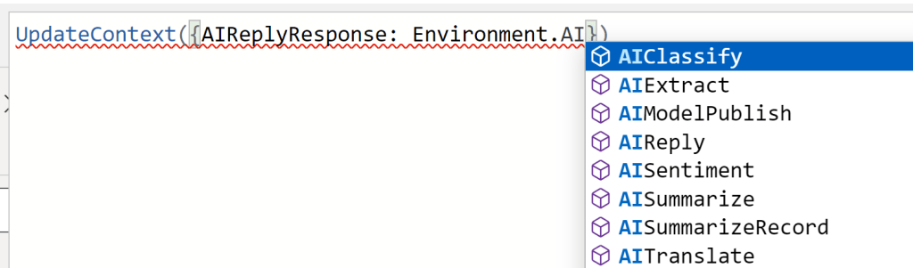 - All the ‘Dataverse AI functions’ can be accessed by ‘Environment.‘ as shown below.