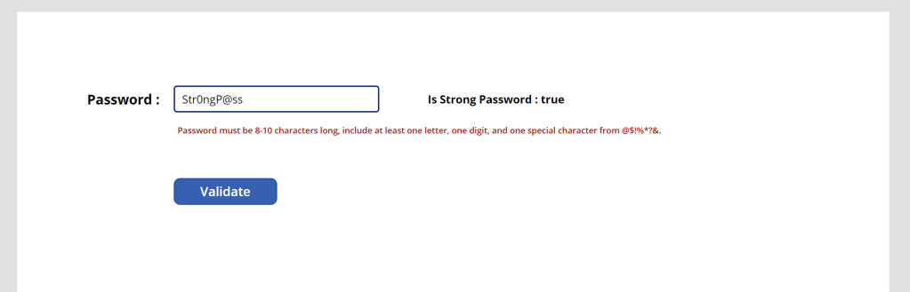 In our blog post example, I am going to validate whether the user has provided a strong password or not. The criteria for a strong password are: ‘Password must be 8-10 characters long, include at least one letter, one digit, and one special character from @$!%*?&.‘