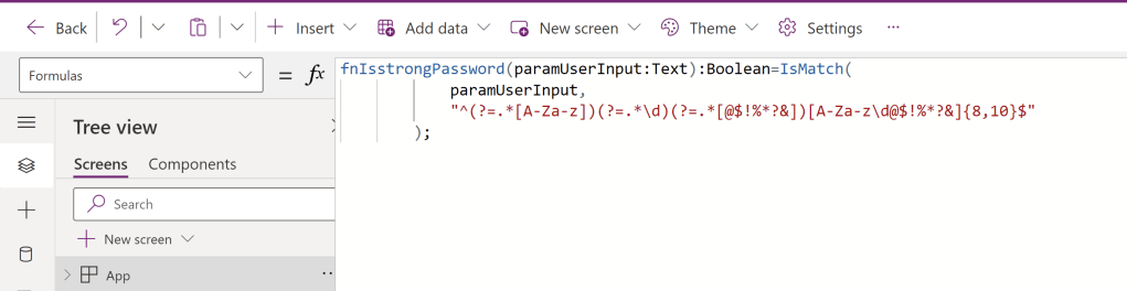 - So, on the ‘OnSelect’ event of the button control, place the following formula with the function fnIsstrongPassword. We are passing the password (i.e., txtUserPassword.Text) as the function input parameter.