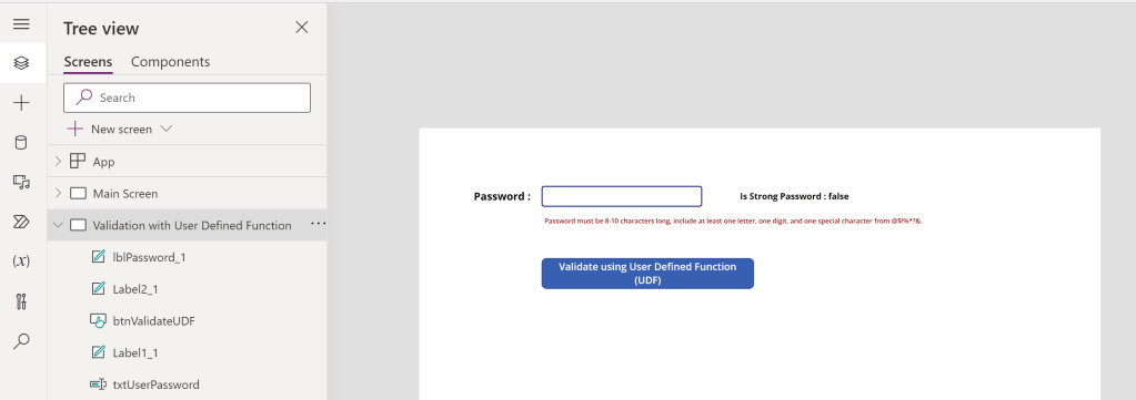 - Create a new Canvas App and add controls as shown below. When the user inputs the password in the ‘txtPassword’ control and clicks on the ‘Validate’ button, we will validate whether the password matches the criteria.